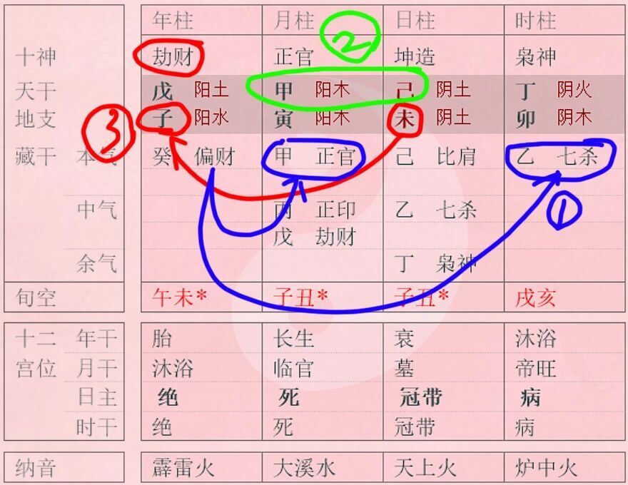 在八字中,天干的夫星为“明”,地支的夫星为“暗”。夫妻宫和子孙宫是命主自己家,命主自己家里住的是七杀,在暗处。但命主却跟不在家里的正官相合——家里有,外面还有。